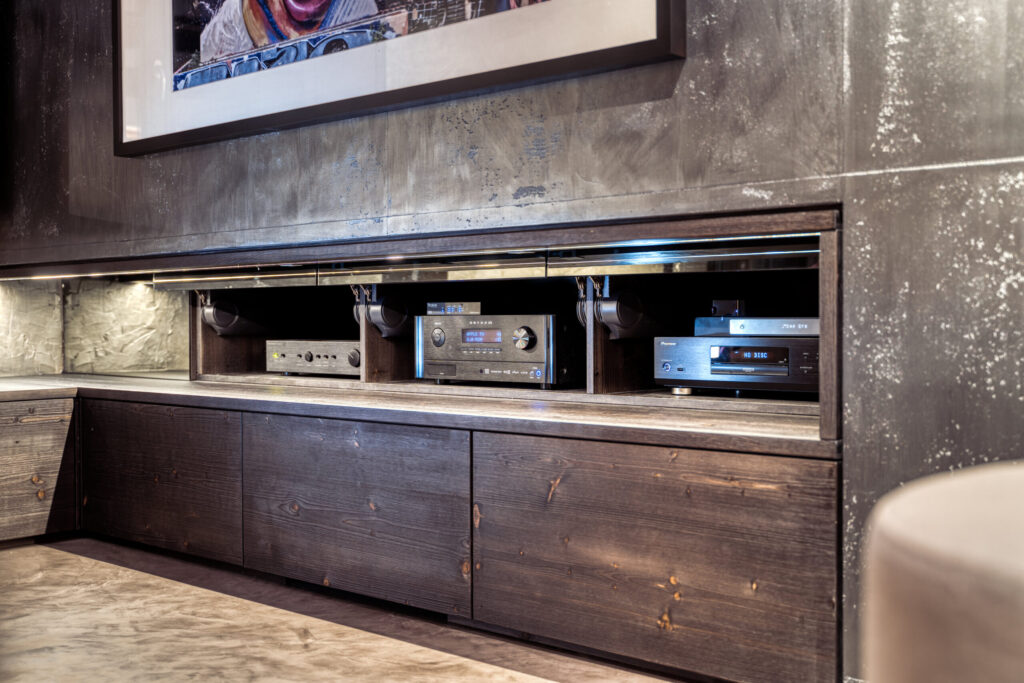 Ein eindrucksvolles Beispiel für harmonische Verbindung von Technik und Design, bei dem anspruchsvolle Unterhaltungselektronik dezent im Raum verschwindet, aber technisch auf höchstem Niveau erlebbar bleibt – ideal für inspirierende Wohn und Showcase Umgebungen.